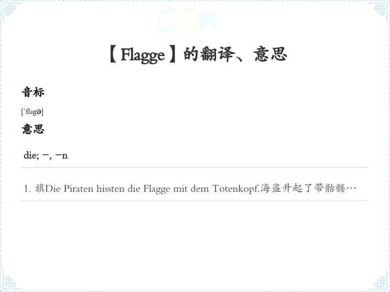 旗Die Piraten hissten die Flagge mit dem Totenkopf.海盗升起了带骷髅图案的旗子。Der Tanker fährt unter libanesischer Flagge.这条油轮挂着黎巴嫩的国旗航行。