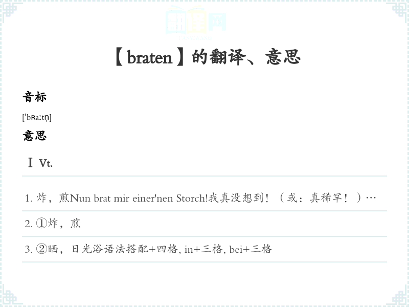 炸,煎Nun brat mir einer'nen Storch!我真没想到!(或:真稀罕!)(表示惊讶或愤怒)Ⅱ Vi.
