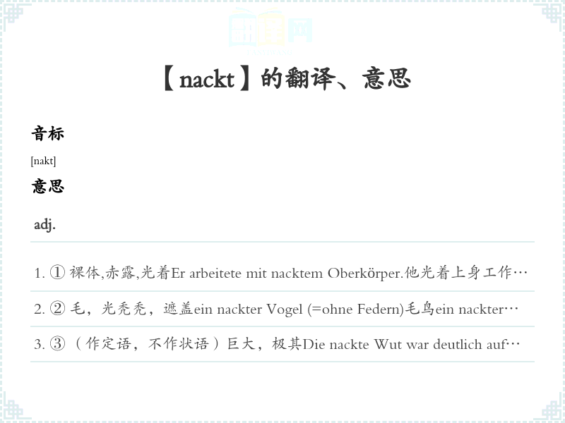 ② 毛,光秃秃,遮盖ein nackter Vogel (=ohne Federn)毛鸟ein nackter Baum (=ohne Blätter) 颗光秃秃树ein nackter Raum (=ohne Möbel) 空屋子auf dem nackten Boden sitzen 坐在光地上