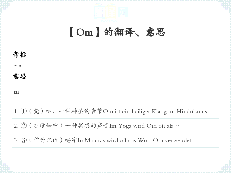 ①(梵)唵,一种神圣的音节Om ist ein heiliger Klang im Hinduismus.