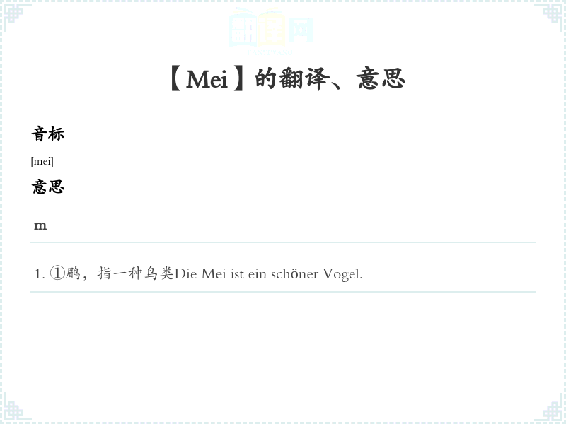①鹛,指一种鸟类Die Mei ist ein schöner Vogel.