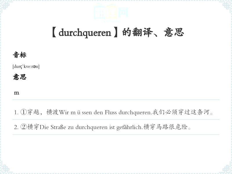 ①穿越,横渡Wir müssen den Fluss durchqueren.我们必须穿过这条河。