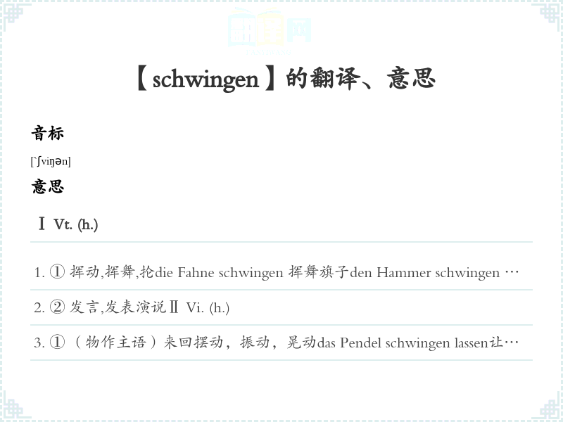②(滑雪时)作转向动作下滑ins Tal, zu Tal schwingen滑进,向山谷Ⅳ Vr. (h.)跃,,跳sich auf das Fahrrad schwingen. 一跃而起行车Das Flugzeug schwingt sich in die Luft.飞机飞天空。语法搭配+四格, +三格