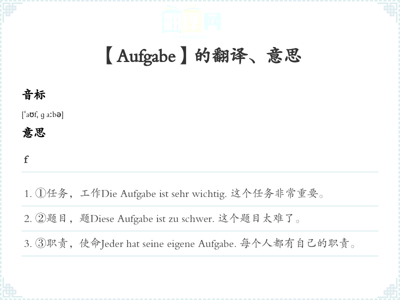 ①任务,工作Die Aufgabe ist sehr wichtig. 这个任务非常重要。