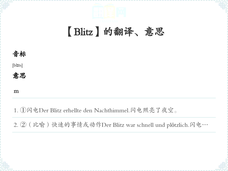 ②(比喻)快速的事情或动作Der Blitz war schnell und plötzlich.闪电来得快而突然。