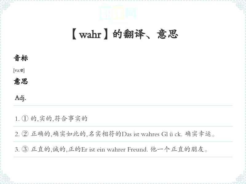 ③ 正直的,诚的,正的Er ist ein wahrer Freund. 他一个正直的朋友。