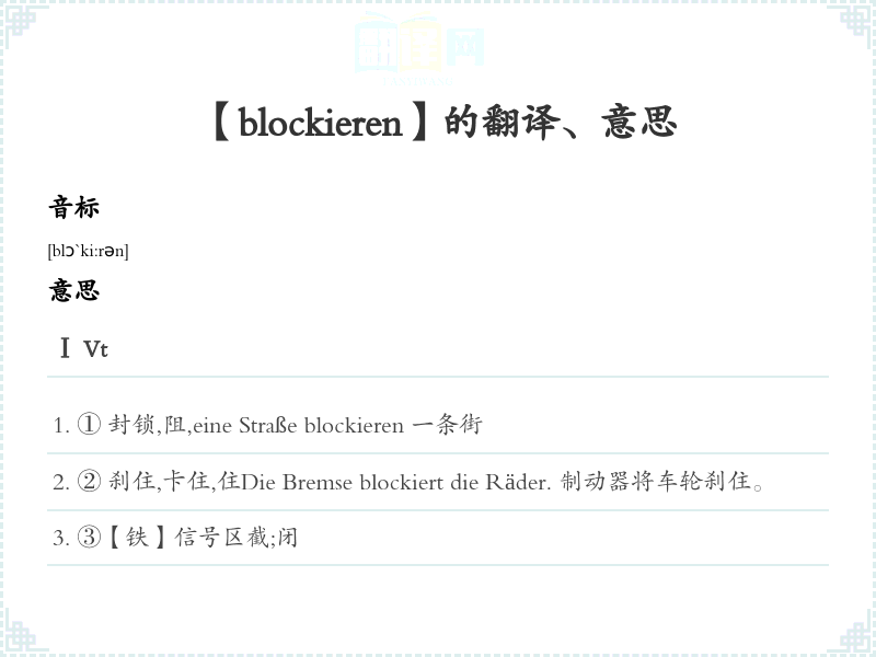 ② 刹住,卡住,住Die Bremse blockiert die Räder. 制动器将车轮刹住。