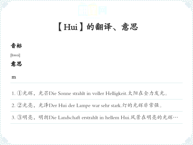 ②光亮,光泽Der Hui der Lampe war sehr stark.灯的光辉非常强。