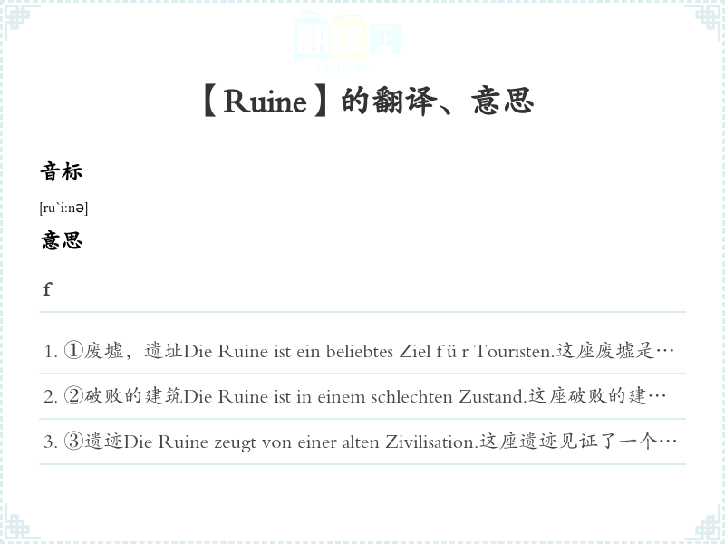 ①废墟,遗址Die Ruine ist ein beliebtes Ziel für Touristen.这座废墟是游客们喜爱的景点。