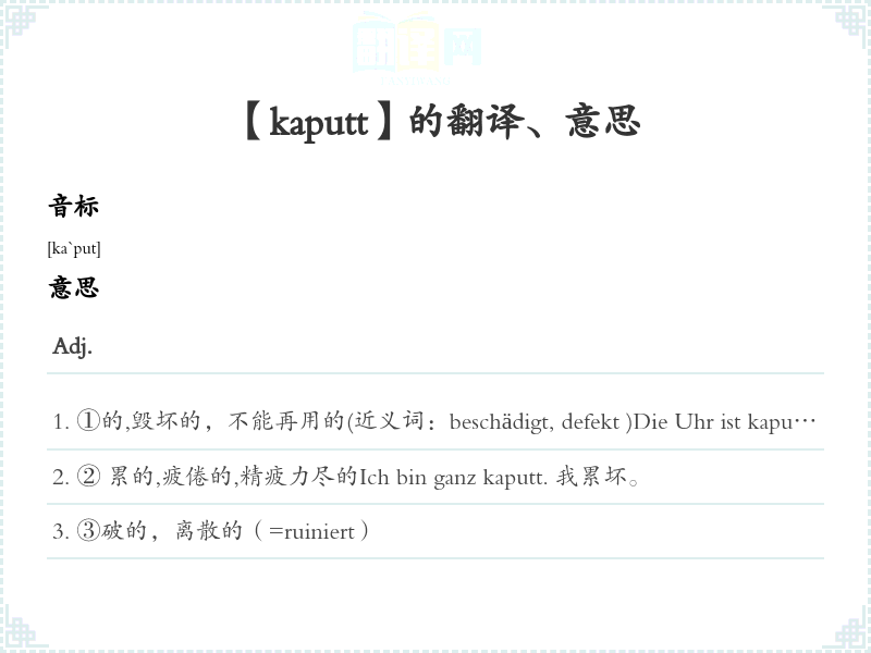 ①的,毁坏的,不能再用的(近义词:beschädigt, defekt )Die Uhr ist kaputt. 钟坏。Die Firma ist kaputt. 公司破产。