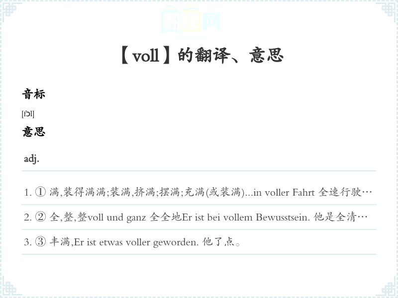 ② 全,整,整voll und ganz 全全地Er ist bei vollem Bewusstsein. 他是全清醒。ein volles Dutzend 整整一打aus vollem Herzen danken 衷心地感谢