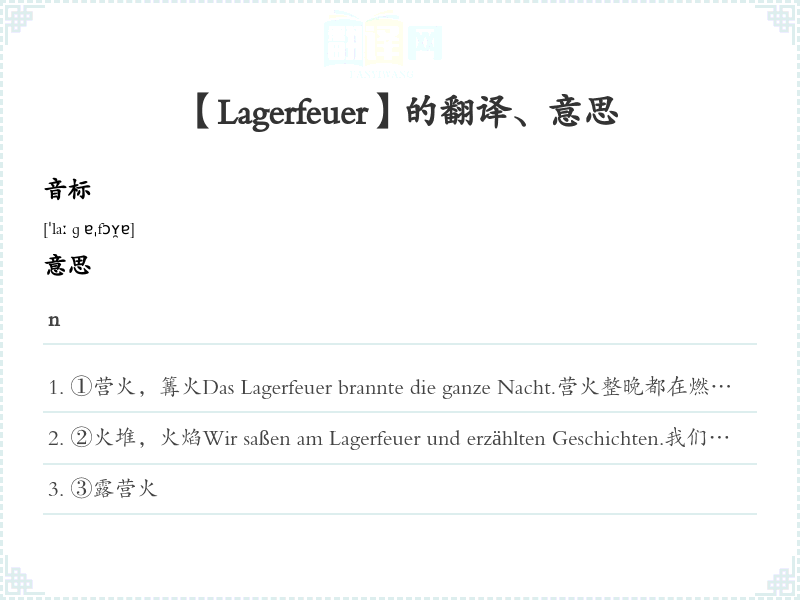 ①营火,篝火Das Lagerfeuer brannte die ganze Nacht.营火整晚都在燃烧。