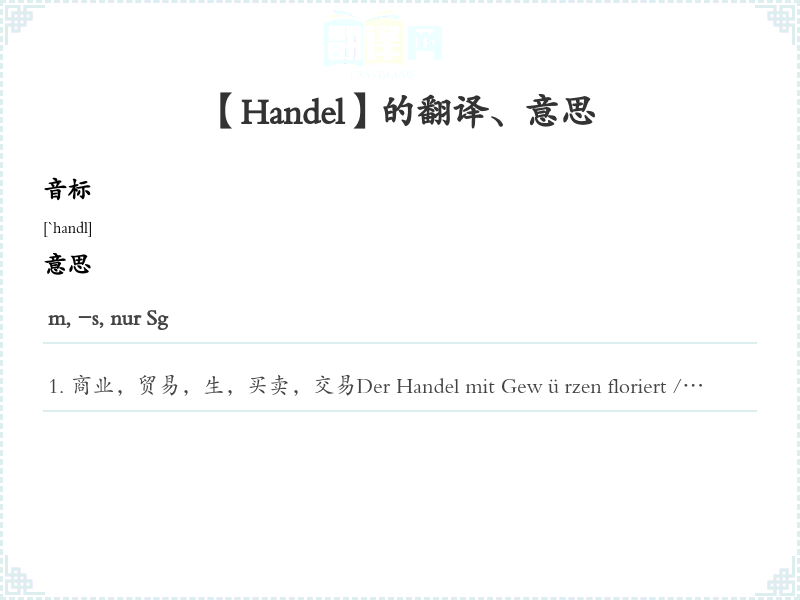 商业,贸易,生,买卖,交易Der Handel mit Gewürzen floriert / stagniert / geht zurück.香料生很兴隆/不景气/衰退。Der Handel sah sich zu einer Erhöhung der Preisege gezwungen.业界认为不得不提高价格。Das Buch, das Sie suchen, ist seit einiger Zeit nicht mehr im Handel.您要的书一段时间已经不销了。