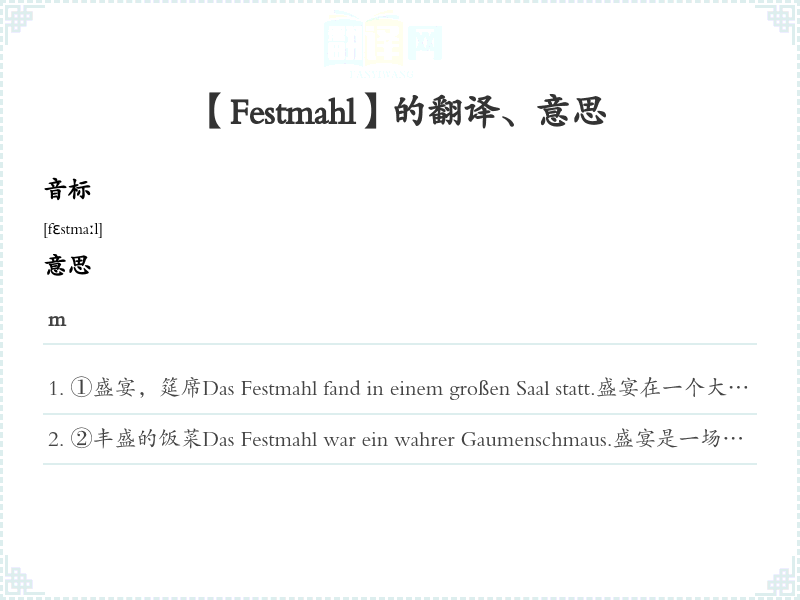 ①盛宴,筵席Das Festmahl fand in einem großen Saal statt.盛宴在一个大宴会厅举行。