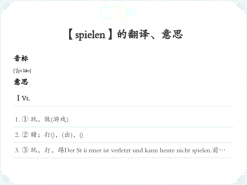 ③ <奥> 1)当儿戏 2)轻而易举地做 奥>Ⅳ spielend(P.Ⅰ) Ⅴgespielt(P.Ⅱ)语法搭配sich+四格, +四格, mit+三格, in+三格, neben+三格, in+四格, um+四格, auf+三格, gegen+四格, für+四格, an+三格, bei+三格