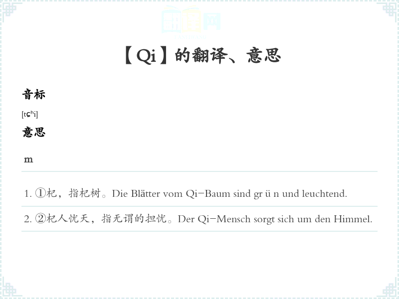 ①杞,指杞树。Die Blätter vom Qi-Baum sind grün und leuchtend.