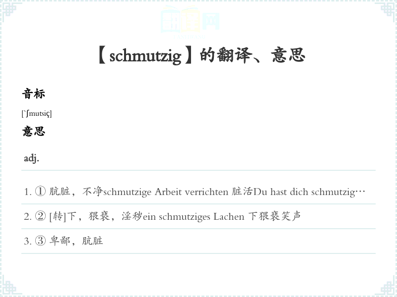 ① 肮脏,不净schmutzige Arbeit verrichten 脏活Du hast dich schmutzig gemacht. 你把自己弄脏了。Man soll seine schmutzige Wäsche nicht vor anderen waschen. [谚]不要把脏衣服当着外人面来洗。(意指:家丑不可外扬)