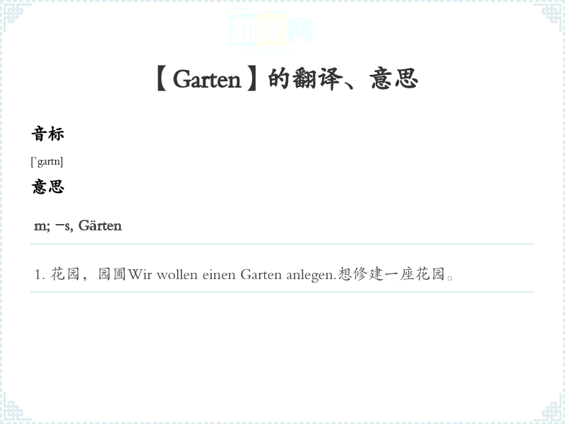 花园,园圃Wir wollen einen Garten anlegen.想修建一座花园。