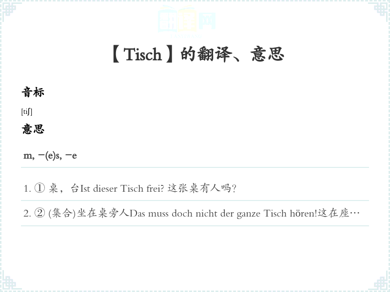 ② (集合)坐在桌旁人Das muss doch nicht der ganze Tisch hören!这在座人都听!Bitte zu Tisch, das Essen ist fertig!请入席,饭菜已就绪!