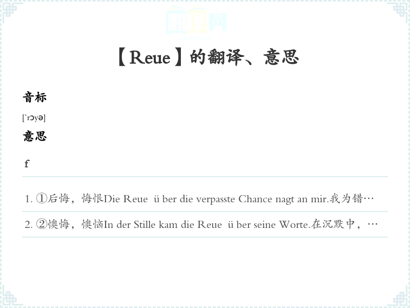 ②懊悔,懊恼In der Stille kam die Reue über seine Worte.在沉默中,他对自己说过的话感到懊悔。