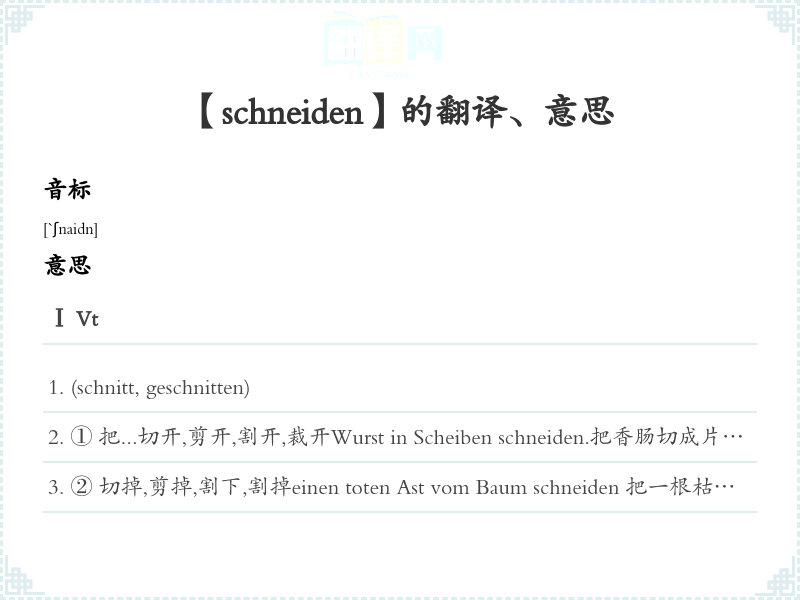 ① 把...切开,剪开,割开,裁开Wurst in Scheiben schneiden.把香肠切成片。den Apfel in zwei Hälften schneiden 把苹果切成两半