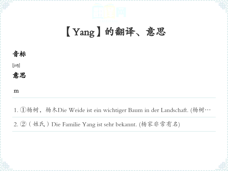 ②(姓氏)Die Familie Yang ist sehr bekannt. (杨家非常有名)