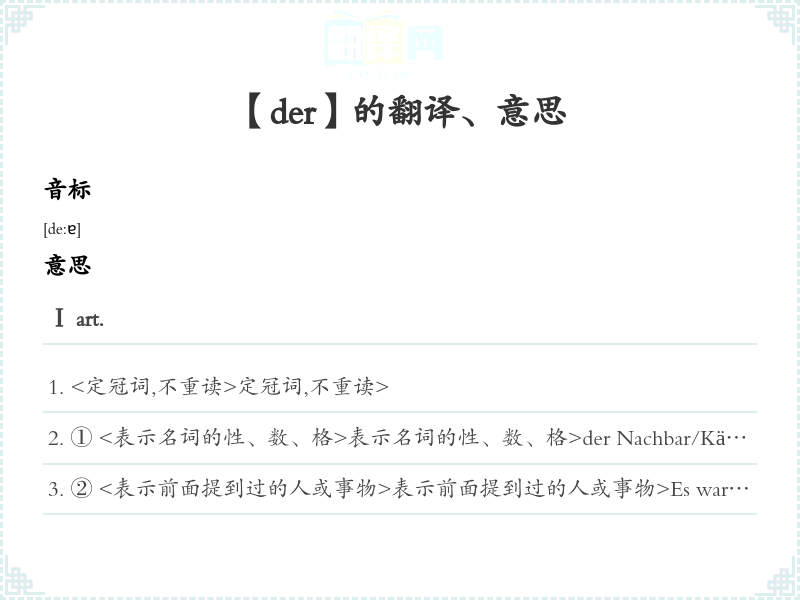 ② <代替人称代词er,sie,es>他;她;它;他们代替人称代词er,sie,es>Wo ist Klaus? Der ist in der Sitzung. Klaus在哪儿?他在开会。Ⅲ pron.<关系代词>关系代词>die Dame, der ich begegnete 我碰到的那位女士