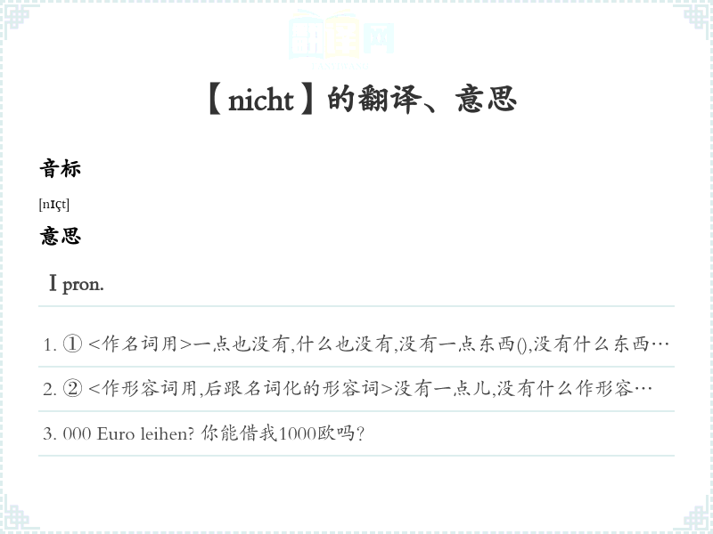 ② <作形容词用,后跟名词化的形容词>没有一点儿,没有什么作形容词用,后跟名词化的形容词>Ⅱ adv.,没有Ich weiß nicht. 我知道。nicht öffentlich 非公开nicht [ein]mal 连...也nicht mehr 再Bitte nicht! 请别这样。Ⅲ Partikel...吗?是吗?Sie schuldet dir doch noch Geld, nicht? 欠你钱,对吧?Kannst du mir nicht