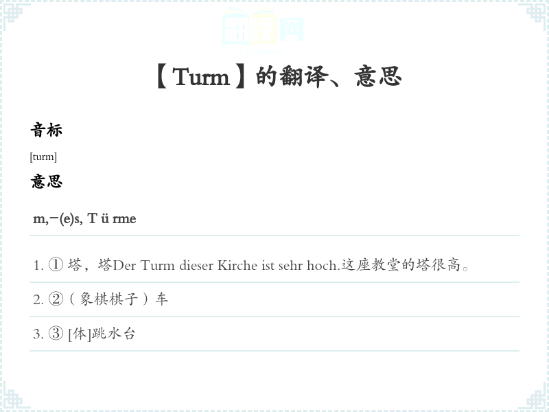 ① 塔,塔Der Turm dieser Kirche ist sehr hoch.这座教堂的塔很高。