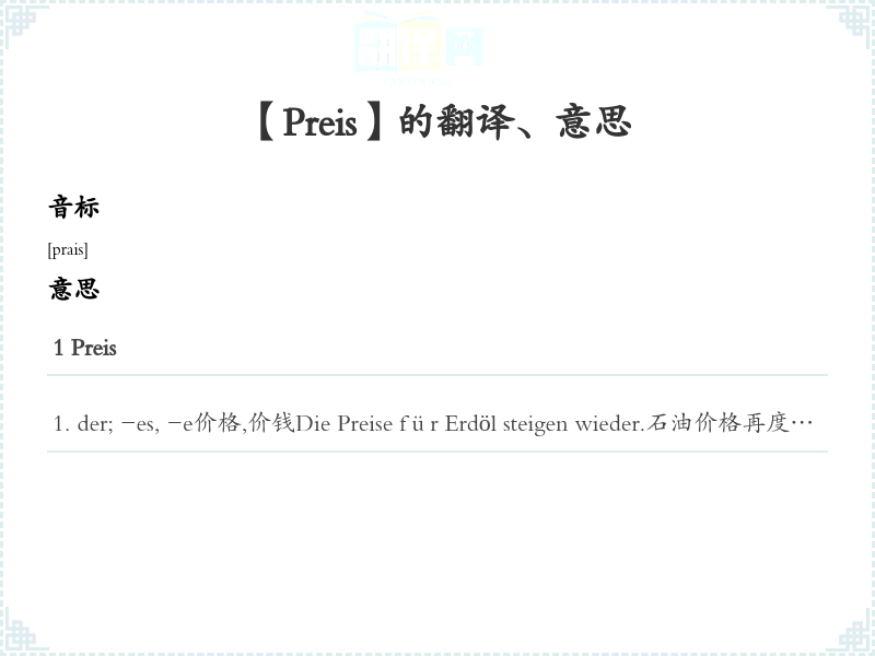 der; -es, -e价格,价钱Die Preise für Erdöl steigen wieder.石油价格再度上涨。2 Preisder; -es, -e奖赏,奖金3 Preisder; -es;nur Sg称赞,表扬,赞扬= Lob