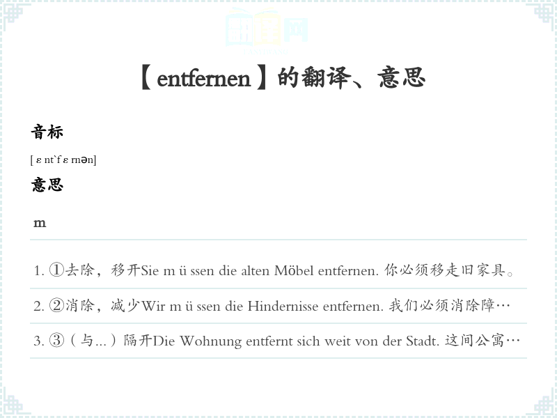 ①去除,移开Sie müssen die alten Möbel entfernen. 你必须移走旧家具。