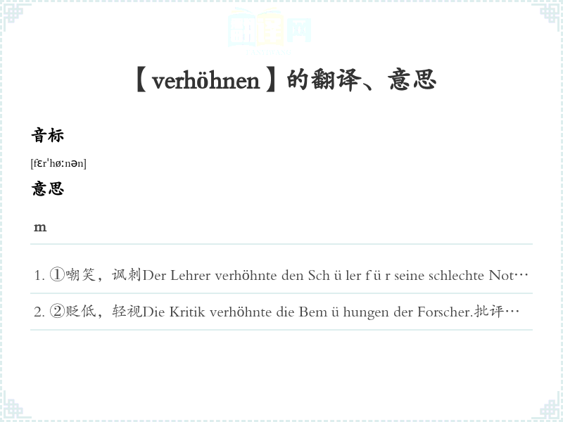 ①嘲笑,讽刺Der Lehrer verhöhnte den Schüler für seine schlechte Note.老师因学生的差分嘲笑他。