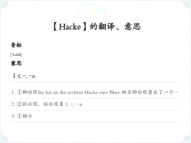 ①脚后跟Sie hat an der rechten Hacke eine Blase.她右脚后跟磨出了一个泡。