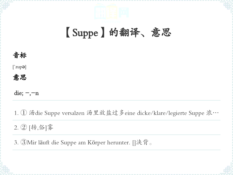 ① 汤die Suppe versalzen 汤里放盐过多eine dicke/klare/legierte Suppe 浓的/清的/稠的汤