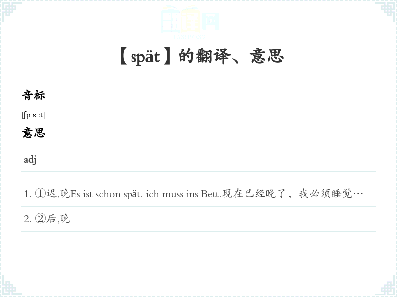 ①迟,晚Es ist schon spät, ich muss ins Bett.现在已经晚了,我必须睡觉了。In den späten Sechzigerjahren kam es zu großen Demonstrationen der Studenten.在六十年代后发生了大规模学生游行。einen späteren Zug nehmen 乘坐晚些时候火车