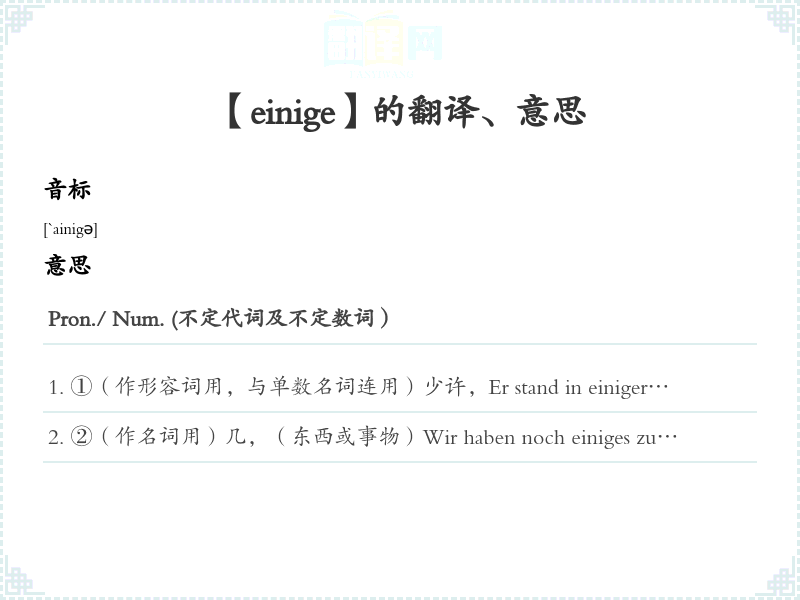 ①(作形容词用,与单数名词连用)少许,Er stand in einiger Entfernung.他在离这儿有段距离的地方站着。(他站在稍远处。)Sie besitzt bereits einige Erfahrungen auf diesem Gebiet.他在这方面已有经验。Das Stück hatte einigen Erfolg.这出戏还算成功。Einiges Geld hatte ich noch.我还有钱。In dem Buch ist einiges Gutes zu finden.这本书里还有精彩的地方。Es sind nur einige Fehler zu verbessern.只有几错误需要改正。Es ist einige Grade kälter als gestern.今天比昨天冷几度。Dieser Student ist einige zwanzig Jahre alt.这大学生十几岁。Der Fall hat einiges Aufsehen erregt.这事件引起了很大的轰动,