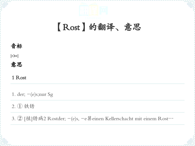 ② [植]锈病2 Rostder; -(e)s, -e箅einen Kellerschacht mit einem Rost abdecken, damit niemand hineinfällt把箅放在井口,以免有人掉下去einen Rost über ein Feuer legen und darauf Würstchen braten把箅放在火上,并在上香肠