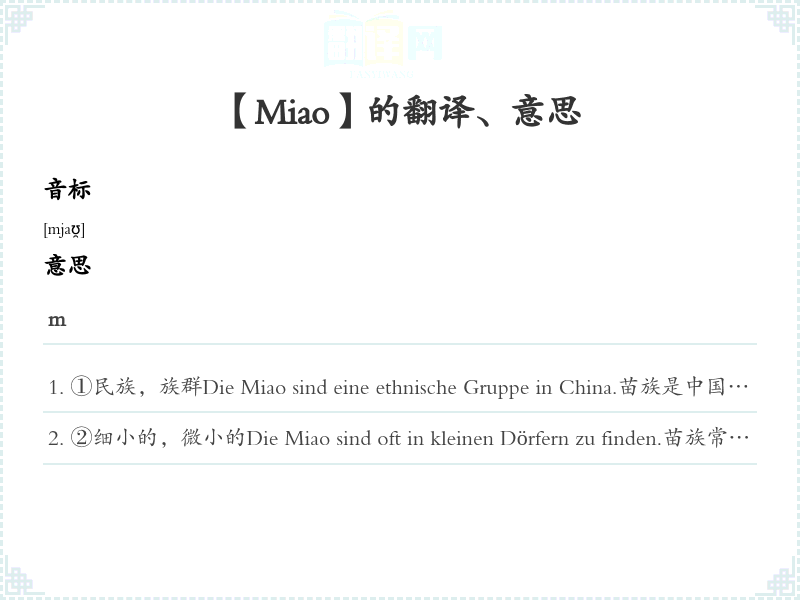 ①民族,族群Die Miao sind eine ethnische Gruppe in China.苗族是中国的一个民族。