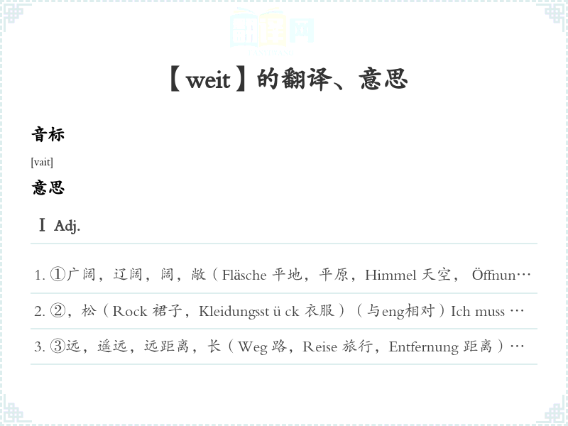 ①广阔,辽阔,阔,敞(Fläsche 平地,平原,Himmel 天空, Öffnung 洞口,Raum 空间, Wälder 树林)(跟eng 相对)Von dort aus hat man einen weiten Blick.人们从那里可以眺望远处。Das ist ein weites Feld.对此事谈话范围很广。Die Sache hat weite Kreise gezogen.这事儿牵涉面很广。