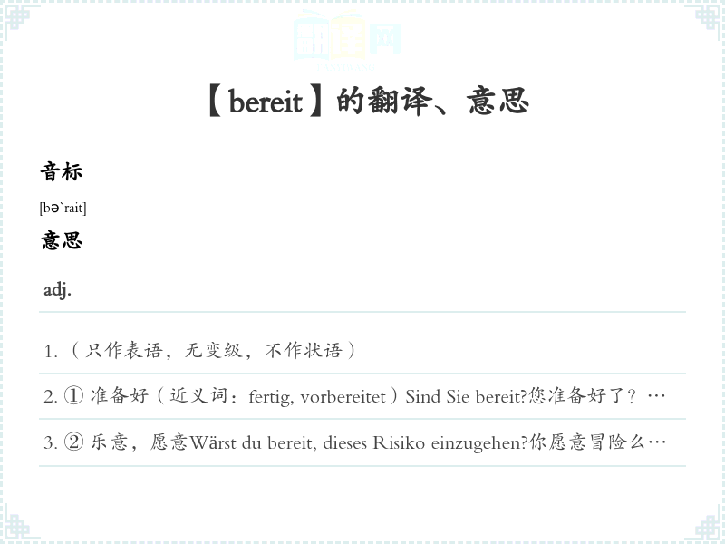 ① 准备好(近义词:fertig, vorbereitet)Sind Sie bereit?您准备好了?Wir sind bereit zur Abfahrt.我们准备出发。