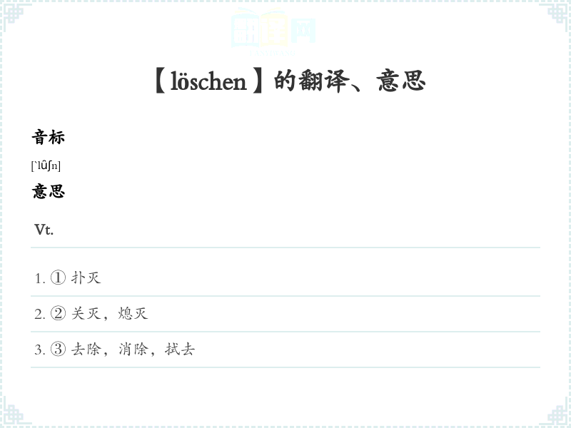 ⑤ [海员用语]卸货,把...卸下Vi.吸水,吸干Das Löschpapier löscht die Tinte schlecht.这张吸墨水纸吸水性不好。语法搭配+四格, mit+三格, aus+三格