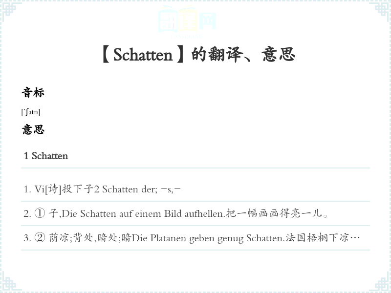 ② 荫凉;背处,暗处;暗Die Platanen geben genug Schatten.法国梧桐下凉很。