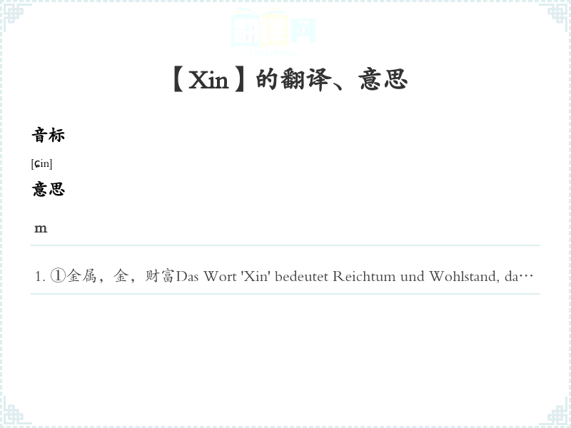 ①金属,金,财富Das Wort 'Xin' bedeutet Reichtum und Wohlstand, da es aus drei '金' besteht. 这个词'鑫'意味着财富和繁荣,因为它由三个'金'组成。