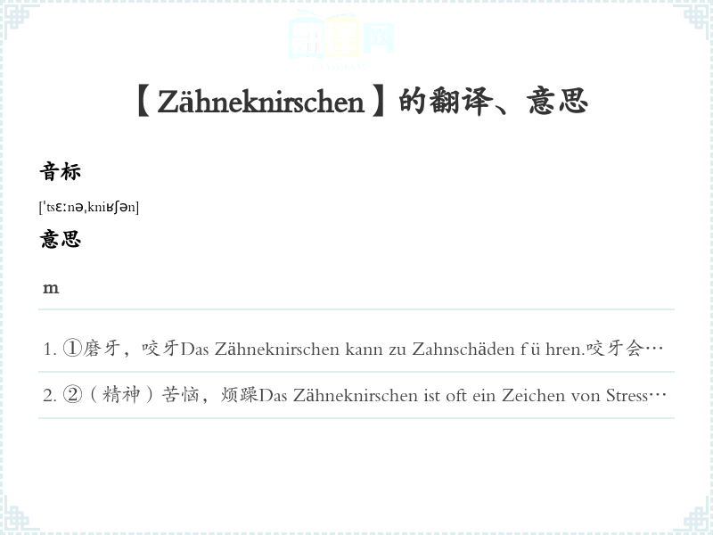 ②(精神)苦恼,烦躁Das Zähneknirschen ist oft ein Zeichen von Stress.磨牙常常是压力的一个迹象。
