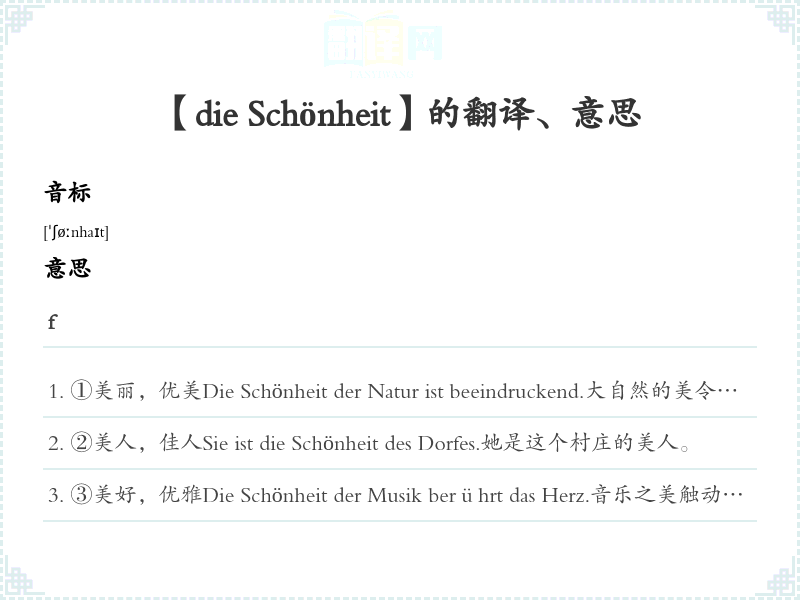②美人,佳人Sie ist die Schönheit des Dorfes.她是这个村庄的美人。