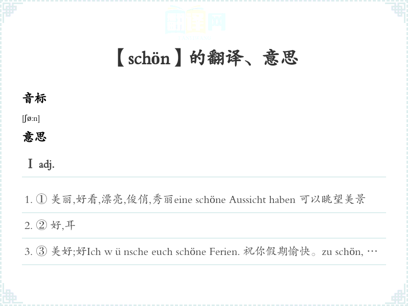 ③ 美好;好Ich wünsche euch schöne Ferien. 祝你假期愉快。zu schön, um wahr zu sein 好令人不能相信