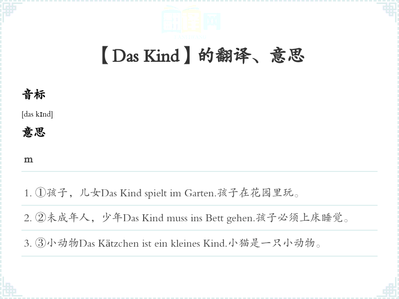 ①孩子,儿女Das Kind spielt im Garten.孩子在花园里玩。