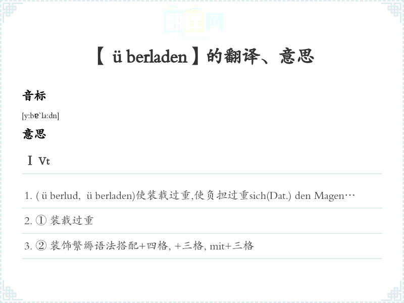 (überlud, überladen)使装载过重,使负担过重sich(Dat.) den Magen überladen 饮食过量Ⅱ adj