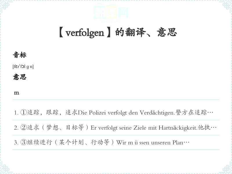 ①追踪,跟踪,追求Die Polizei verfolgt den Verdächtigen.警方在追踪嫌疑犯。