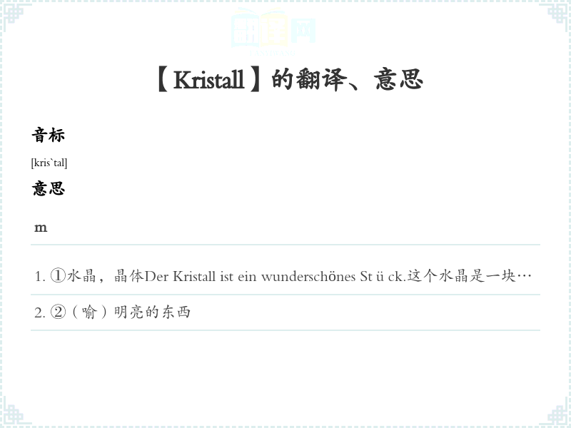 ①水晶,晶体Der Kristall ist ein wunderschönes Stück.这个水晶是一块美丽的作品。